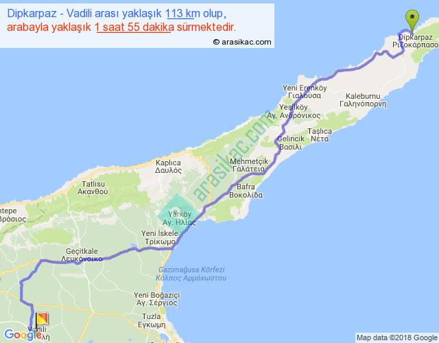 Dipkarpaz - Vadili arası yaklaşık olarak 90 km/h ile yukarıda belirtilen sürede olup, iki yerin kuş uçuşu uzaklığı (mesafesi) 87'dir. Yolculuk otobüsle 2 saat 29 dakika sürmektedir.