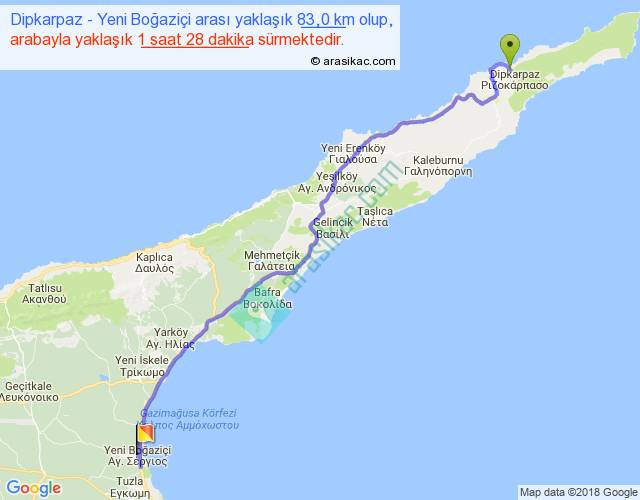 Dipkarpaz - Yeni Boğaziçi arası yaklaşık olarak 90 km/h ile yukarıda belirtilen sürede olup, iki yerin kuş uçuşu uzaklığı (mesafesi) 66'dir. Yolculuk otobüsle 1 saat 54 dakika sürmektedir.