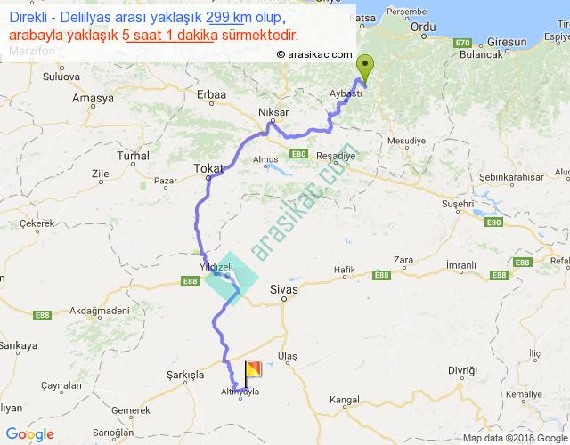 Direkli - Deliilyas arası yaklaşık olarak 90 km/h ile yukarıda belirtilen sürede olup, iki yerin kuş uçuşu uzaklığı (mesafesi) 169'dir. Yolculuk otobüsle 6 saat 31 dakika sürmektedir.