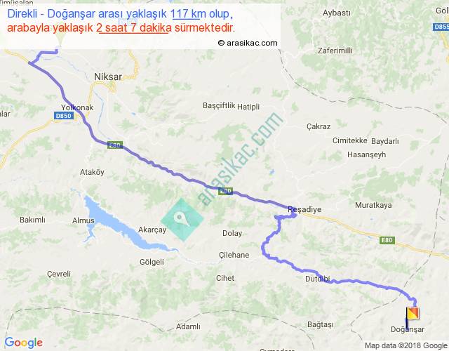 Direkli - Doğanşar arası yaklaşık olarak 90 km/h ile yukarıda belirtilen sürede olup, iki yerin kuş uçuşu uzaklığı (mesafesi) 74'dir. Yolculuk otobüsle 2 saat 45 dakika sürmektedir.