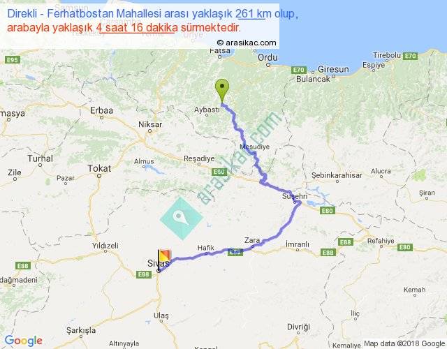 Direkli - Ferhatbostan Mahallesi arası yaklaşık olarak 90 km/h ile yukarıda belirtilen sürede olup, iki yerin kuş uçuşu uzaklığı (mesafesi) 118'dir. Yolculuk otobüsle 5 saat 32 dakika sürmektedir.