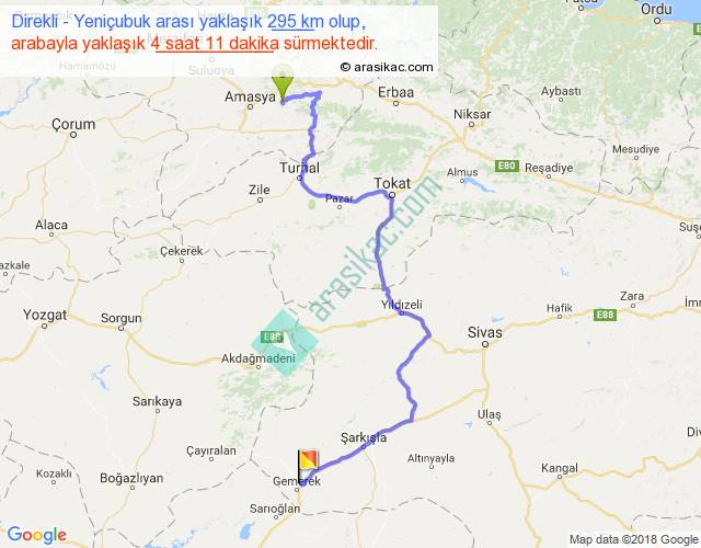 Direkli - Yeniçubuk arası yaklaşık olarak 90 km/h ile yukarıda belirtilen sürede olup, iki yerin kuş uçuşu uzaklığı (mesafesi) 162'dir. Yolculuk otobüsle 5 saat 26 dakika sürmektedir.