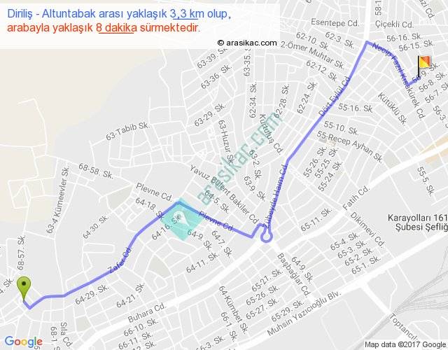 Diriliş - Altuntabak arası yaklaşık olarak 90 km/h ile yukarıda belirtilen sürede olup, iki yerin kuş uçuşu uzaklığı (mesafesi) 2'dir. Yolculuk otobüsle 10 dakika sürmektedir.