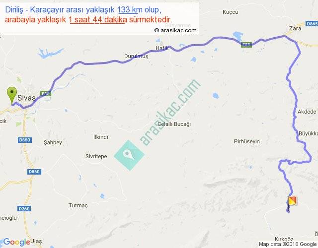Diriliş - Karaçayır arası yaklaşık olarak 90 km/h ile yukarıda belirtilen sürede olup, iki yerin kuş uçuşu uzaklığı (mesafesi) 70'dir. Yolculuk otobüsle 2 saat 15 dakika sürmektedir.