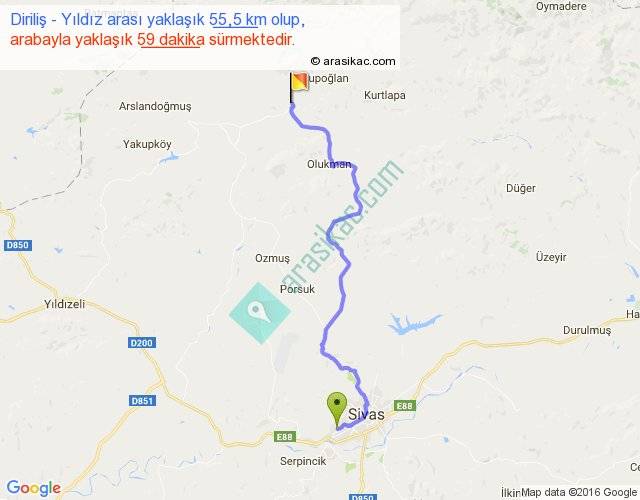 Diriliş - Yıldız arası yaklaşık olarak 90 km/h ile yukarıda belirtilen sürede olup, iki yerin kuş uçuşu uzaklığı (mesafesi) 38'dir. Yolculuk otobüsle 1 saat 16 dakika sürmektedir.
