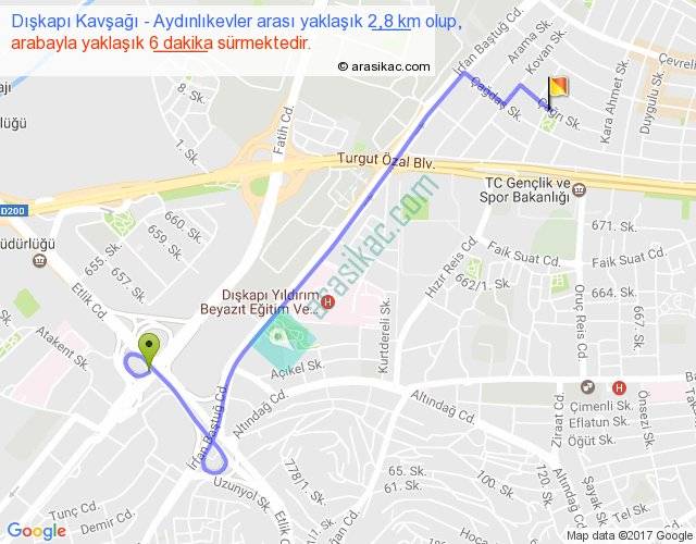 Dışkapı Kavşağı - Aydınlıkevler arası yaklaşık olarak 90 km/h ile yukarıda belirtilen sürede olup, iki yerin kuş uçuşu uzaklığı (mesafesi) 2'dir. Yolculuk otobüsle 7 dakika sürmektedir.