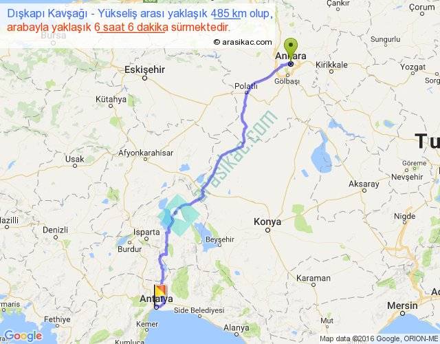 Dışkapı Kavşağı - Yükseliş arası yaklaşık olarak 90 km/h ile yukarıda belirtilen sürede olup, iki yerin kuş uçuşu uzaklığı (mesafesi) 385'dir. Eğer belirtilen yerler arasında uçak seferi var ise bu süre uçakla 35 dakika'ya kadar düşebilir. Yolculuk otobüsle 7 saat 55 dakika sürmektedir.