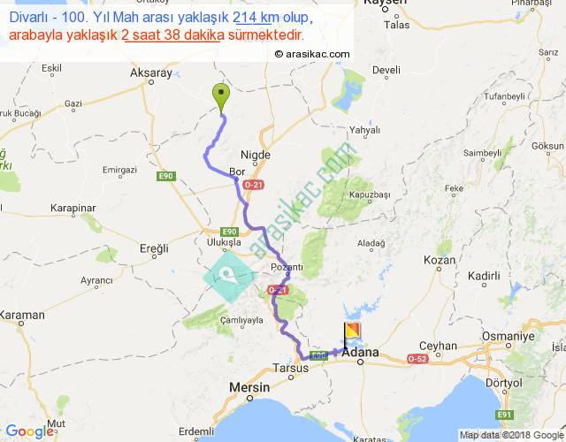 Divarlı - 100. Yıl Mah arası yaklaşık olarak 90 km/h ile yukarıda belirtilen sürede olup, iki yerin kuş uçuşu uzaklığı (mesafesi) 144'dir. Yolculuk otobüsle 3 saat 25 dakika sürmektedir.
