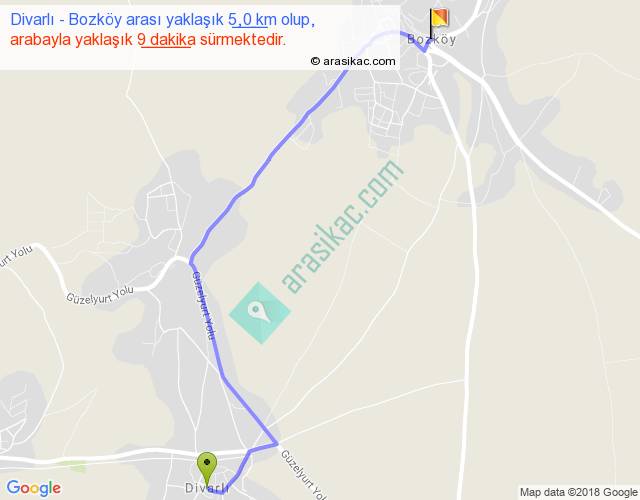 Divarlı - Bozköy arası yaklaşık olarak 90 km/h ile yukarıda belirtilen sürede olup, iki yerin kuş uçuşu uzaklığı (mesafesi) 4'dir. Yolculuk otobüsle 11 dakika sürmektedir.