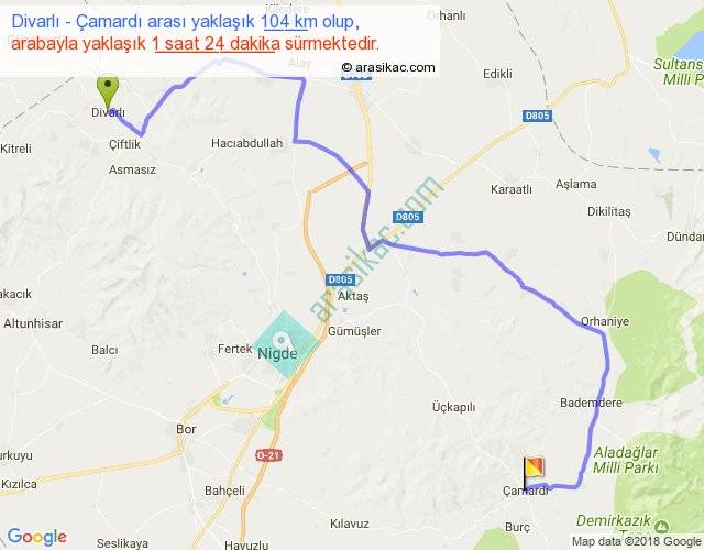 Divarlı - Çamardı arası yaklaşık olarak 90 km/h ile yukarıda belirtilen sürede olup, iki yerin kuş uçuşu uzaklığı (mesafesi) 61'dir. Yolculuk otobüsle 1 saat 49 dakika sürmektedir.