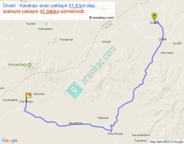 Divarlı - Karakapı arası yaklaşık olarak 90 km/h ile yukarıda belirtilen sürede olup, iki yerin kuş uçuşu uzaklığı (mesafesi) 31'dir. Yolculuk otobüsle 58 dakika sürmektedir.