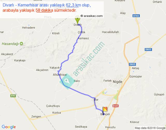 Divarlı - Kemerhisar arası yaklaşık olarak 90 km/h ile yukarıda belirtilen sürede olup, iki yerin kuş uçuşu uzaklığı (mesafesi) 43'dir. Yolculuk otobüsle 1 saat 15 dakika sürmektedir.