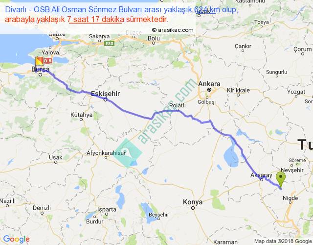 Divarlı - OSB Ali Osman Sönmez Bulvarı arası yaklaşık olarak 90 km/h ile yukarıda belirtilen sürede olup, iki yerin kuş uçuşu uzaklığı (mesafesi) 522'dir. Eğer belirtilen yerler arasında uçak seferi var ise bu süre uçakla 48 dakika'ya kadar düşebilir. Yolculuk otobüsle 9 saat 28 dakika sürmektedir.