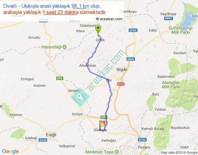 Divarlı - Ulukışla arası yaklaşık olarak 90 km/h ile yukarıda belirtilen sürede olup, iki yerin kuş uçuşu uzaklığı (mesafesi) 73'dir. Yolculuk otobüsle 1 saat 47 dakika sürmektedir.
