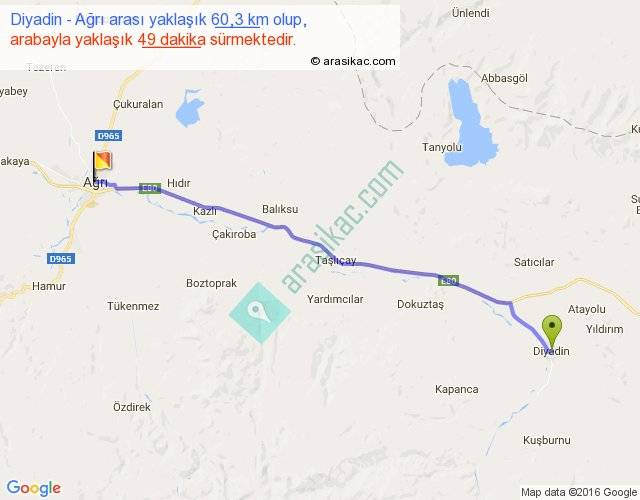 Diyadin - Ağrı arası yaklaşık olarak 90 km/h ile yukarıda belirtilen sürede olup, iki yerin kuş uçuşu uzaklığı (mesafesi) 57'dir. Yolculuk otobüsle 1 saat 3 dakika sürmektedir.