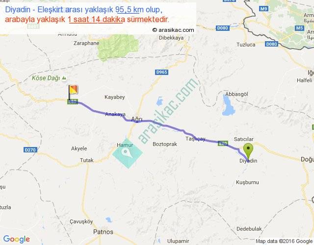 Diyadin - Eleşkirt arası yaklaşık olarak 90 km/h ile yukarıda belirtilen sürede olup, iki yerin kuş uçuşu uzaklığı (mesafesi) 90'dir. Yolculuk otobüsle 1 saat 36 dakika sürmektedir.
