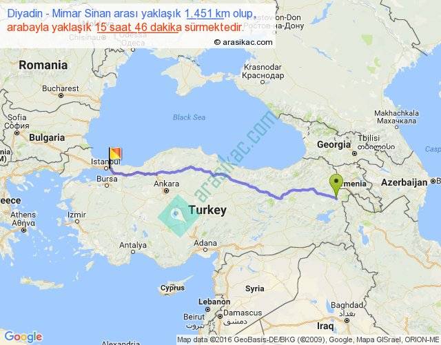 Diyadin - Mimar Sinan arası yaklaşık olarak 90 km/h ile yukarıda belirtilen sürede olup, iki yerin kuş uçuşu uzaklığı (mesafesi) 1225'dir. Eğer belirtilen yerler arasında uçak seferi var ise bu süre uçakla 1 saat 53 dakika'ya kadar düşebilir. Yolculuk otobüsle 20 saat 29 dakika sürmektedir.