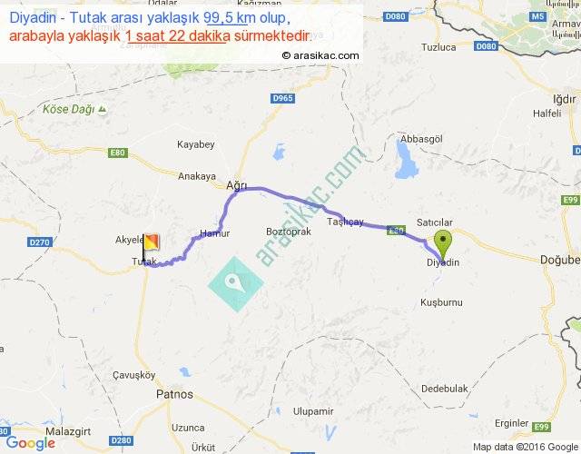 Diyadin - Tutak arası yaklaşık olarak 90 km/h ile yukarıda belirtilen sürede olup, iki yerin kuş uçuşu uzaklığı (mesafesi) 77'dir. Yolculuk otobüsle 1 saat 46 dakika sürmektedir.