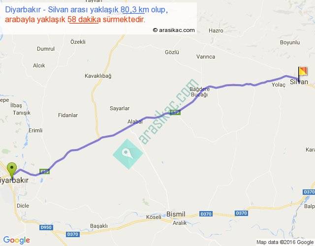 Diyarbakır - Silvan arası yaklaşık olarak 90 km/h ile yukarıda belirtilen sürede olup, iki yerin kuş uçuşu uzaklığı (mesafesi) 74'dir. Yolculuk otobüsle 1 saat 15 dakika sürmektedir.