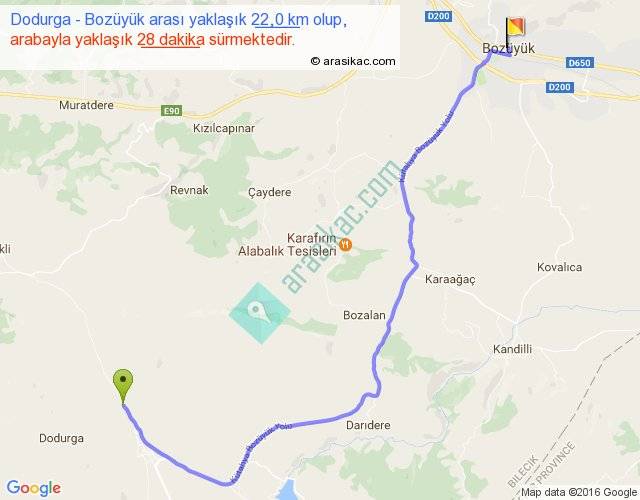 Dodurga - Bozüyük arası yaklaşık olarak 90 km/h ile yukarıda belirtilen sürede olup, iki yerin kuş uçuşu uzaklığı (mesafesi) 15'dir. Yolculuk otobüsle 36 dakika sürmektedir.