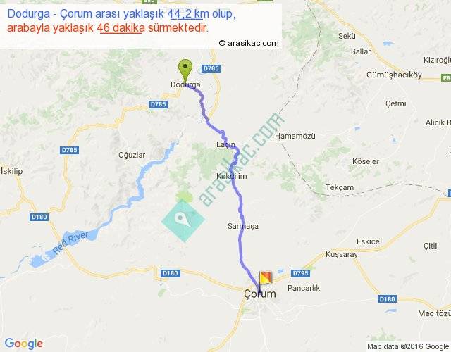 Dodurga - Çorum arası yaklaşık olarak 90 km/h ile yukarıda belirtilen sürede olup, iki yerin kuş uçuşu uzaklığı (mesafesi) 36'dir. Yolculuk otobüsle 59 dakika sürmektedir.
