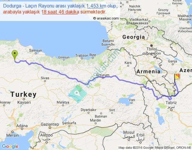 Dodurga - Laçın Rayonu arası yaklaşık olarak 90 km/h ile yukarıda belirtilen sürede olup, iki yerin kuş uçuşu uzaklığı (mesafesi) 999'dir. Eğer belirtilen yerler arasında uçak seferi var ise bu süre uçakla 1 saat 32 dakika'ya kadar düşebilir. Yolculuk otobüsle 1 gün 0 saat sürmektedir.