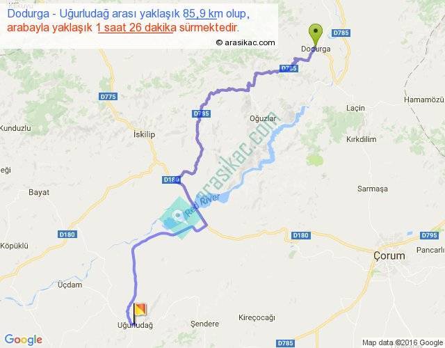 Dodurga - Uğurludağ arası yaklaşık olarak 90 km/h ile yukarıda belirtilen sürede olup, iki yerin kuş uçuşu uzaklığı (mesafesi) 55'dir. Yolculuk otobüsle 1 saat 51 dakika sürmektedir.