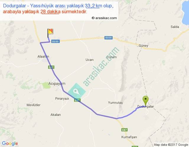 Dodurgalar - Yassıhüyük arası yaklaşık olarak 90 km/h ile yukarıda belirtilen sürede olup, iki yerin kuş uçuşu uzaklığı (mesafesi) 24'dir. Yolculuk otobüsle 36 dakika sürmektedir.
