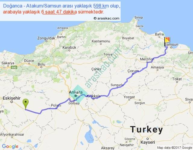 Doğanca - Atakum Samsun arası yaklaşık olarak 90 km/h ile yukarıda belirtilen sürede olup, iki yerin kuş uçuşu uzaklığı (mesafesi) 470'dir. Eğer belirtilen yerler arasında uçak seferi var ise bu süre uçakla 43 dakika'ya kadar düşebilir. Yolculuk otobüsle 8 saat 49 dakika sürmektedir.