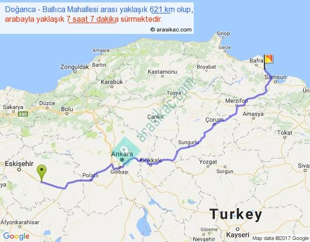 Doğanca - Ballıca Mahallesi arası yaklaşık olarak 90 km/h ile yukarıda belirtilen sürede olup, iki yerin kuş uçuşu uzaklığı (mesafesi) 478'dir. Eğer belirtilen yerler arasında uçak seferi var ise bu süre uçakla 44 dakika'ya kadar düşebilir. Yolculuk otobüsle 9 saat 15 dakika sürmektedir.