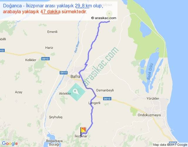 Doğanca - İkizpınar arası yaklaşık olarak 90 km/h ile yukarıda belirtilen sürede olup, iki yerin kuş uçuşu uzaklığı (mesafesi) 23'dir. Yolculuk otobüsle 1 saat 1 dakika sürmektedir.