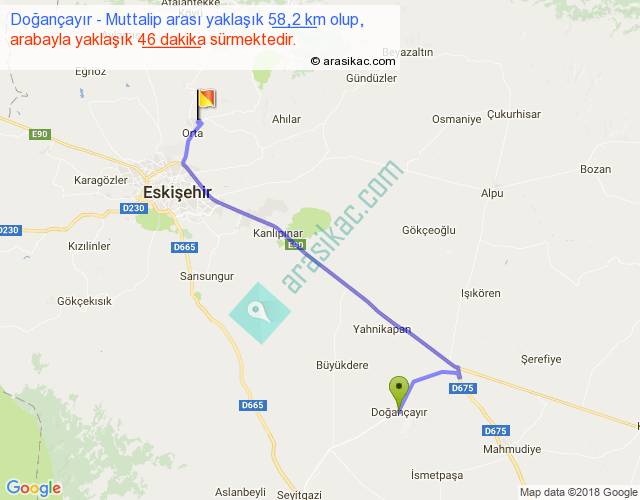 Doğançayır - Muttalip arası yaklaşık olarak 90 km/h ile yukarıda belirtilen sürede olup, iki yerin kuş uçuşu uzaklığı (mesafesi) 41'dir. Yolculuk otobüsle 59 dakika sürmektedir.