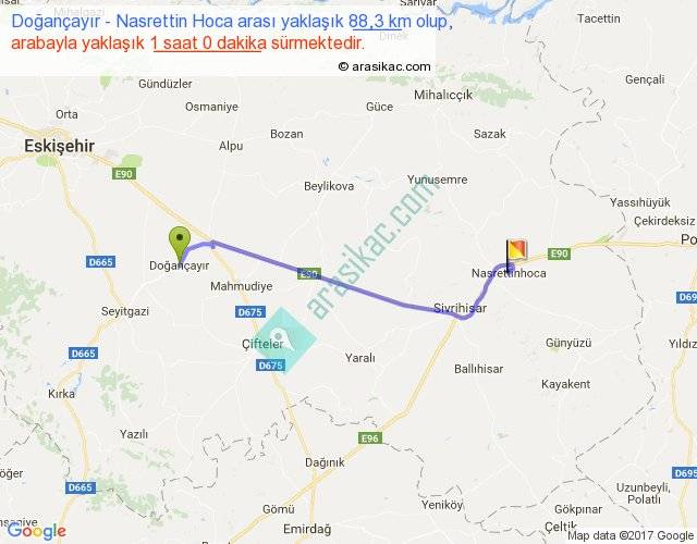 Doğançayır - Nasrettin Hoca arası yaklaşık olarak 90 km/h ile yukarıda belirtilen sürede olup, iki yerin kuş uçuşu uzaklığı (mesafesi) 71'dir. Yolculuk otobüsle 1 saat 18 dakika sürmektedir.