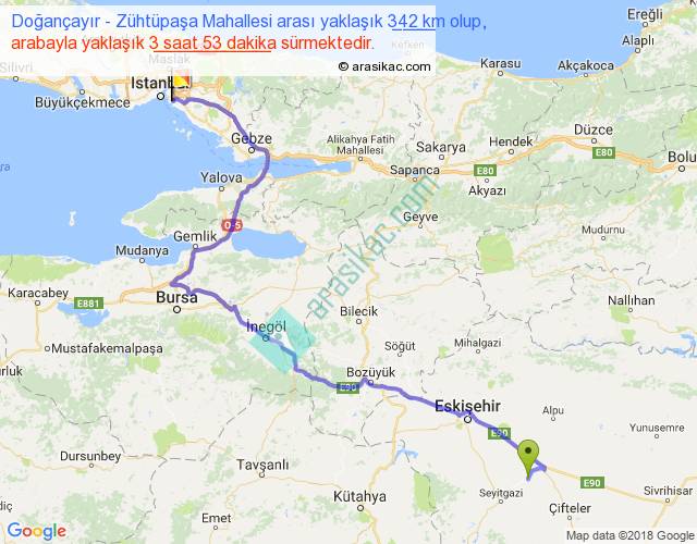 Doğançayır - Zühtüpaşa Mahallesi arası yaklaşık olarak 90 km/h ile yukarıda belirtilen sürede olup, iki yerin kuş uçuşu uzaklığı (mesafesi) 221'dir. Yolculuk otobüsle 5 saat 2 dakika sürmektedir.