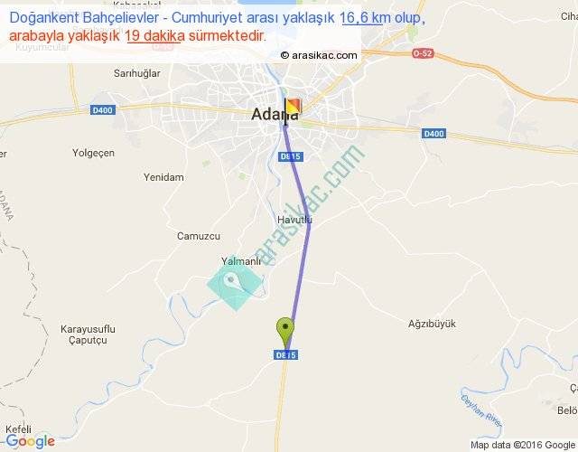 Doğankent Bahçelievler - Cumhuriyet arası yaklaşık olarak 90 km/h ile yukarıda belirtilen sürede olup, iki yerin kuş uçuşu uzaklığı (mesafesi) 15'dir. Yolculuk otobüsle 24 dakika sürmektedir.