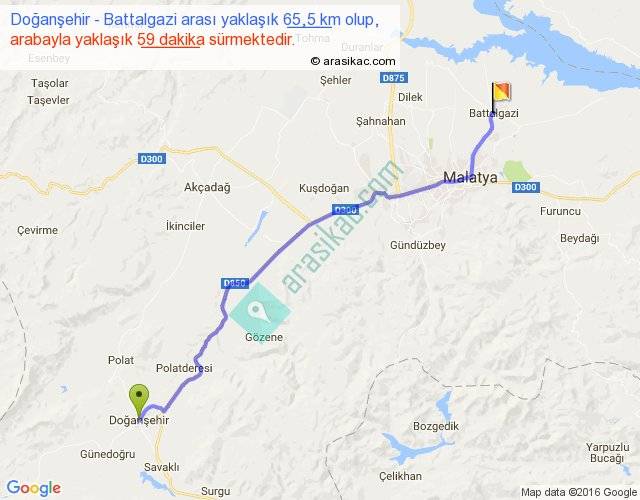 Doğanşehir - Battalgazi arası yaklaşık olarak 90 km/h ile yukarıda belirtilen sürede olup, iki yerin kuş uçuşu uzaklığı (mesafesi) 56'dir. Yolculuk otobüsle 1 saat 16 dakika sürmektedir.