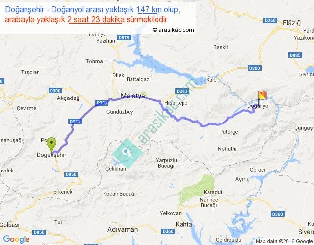 Doğanşehir - Doğanyol arası yaklaşık olarak 90 km/h ile yukarıda belirtilen sürede olup, iki yerin kuş uçuşu uzaklığı (mesafesi) 104'dir. Yolculuk otobüsle 3 saat 5 dakika sürmektedir.
