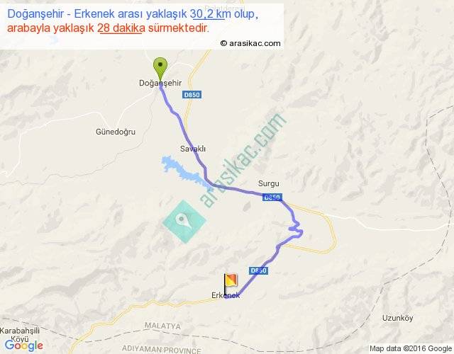 Doğanşehir - Erkenek arası yaklaşık olarak 90 km/h ile yukarıda belirtilen sürede olup, iki yerin kuş uçuşu uzaklığı (mesafesi) 19'dir. Yolculuk otobüsle 36 dakika sürmektedir.