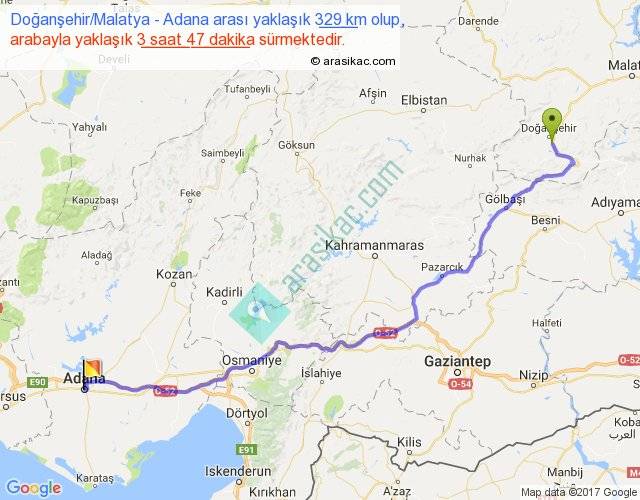 Doğanşehir Malatya - Adana arası yaklaşık olarak 90 km/h ile yukarıda belirtilen sürede olup, iki yerin kuş uçuşu uzaklığı (mesafesi) 254'dir. Eğer belirtilen yerler arasında uçak seferi var ise bu süre uçakla 23 dakika'ya kadar düşebilir. Yolculuk otobüsle 4 saat 55 dakika sürmektedir.