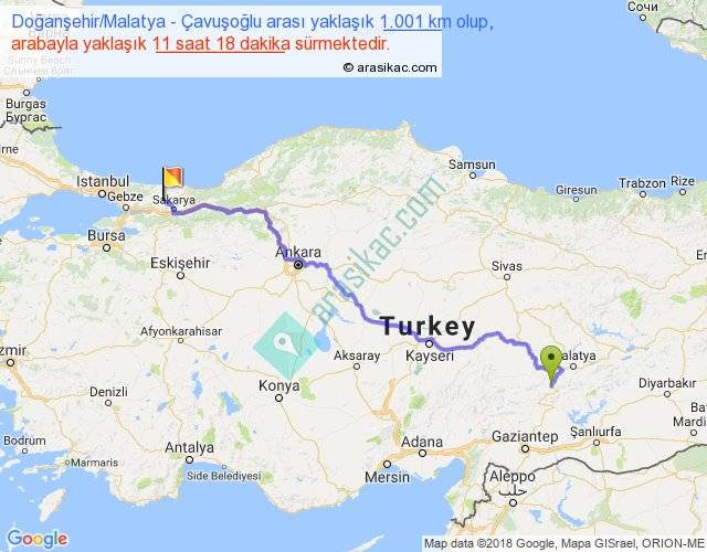 Doğanşehir Malatya - Çavuşoğlu arası yaklaşık olarak 90 km/h ile yukarıda belirtilen sürede olup, iki yerin kuş uçuşu uzaklığı (mesafesi) 726'dir. Eğer belirtilen yerler arasında uçak seferi var ise bu süre uçakla 1 saat 07 dakika'ya kadar düşebilir. Yolculuk otobüsle 14 saat 41 dakika sürmektedir.