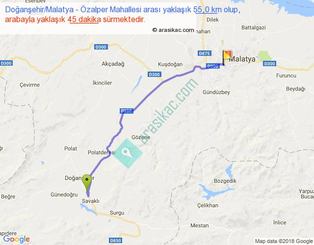 Doğanşehir Malatya - Özalper Mahallesi arası yaklaşık olarak 90 km/h ile yukarıda belirtilen sürede olup, iki yerin kuş uçuşu uzaklığı (mesafesi) 46'dir. Yolculuk otobüsle 58 dakika sürmektedir.