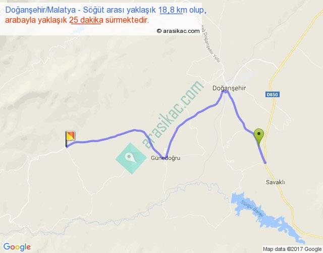 Doğanşehir Malatya - Söğüt arası yaklaşık olarak 90 km/h ile yukarıda belirtilen sürede olup, iki yerin kuş uçuşu uzaklığı (mesafesi) 696'dir. Eğer belirtilen yerler arasında uçak seferi var ise bu süre uçakla 1 saat 04 dakika'ya kadar düşebilir. Yolculuk otobüsle 13 saat 55 dakika sürmektedir.
