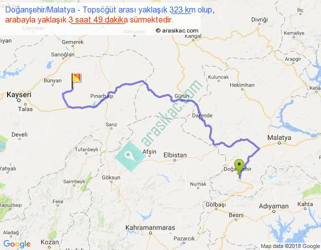 Doğanşehir Malatya - Topsöğüt arası yaklaşık olarak 90 km/h ile yukarıda belirtilen sürede olup, iki yerin kuş uçuşu uzaklığı (mesafesi) 179'dir. Yolculuk otobüsle 4 saat 57 dakika sürmektedir.