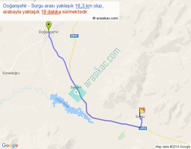 Doğanşehir - Surgu arası yaklaşık olarak 90 km/h ile yukarıda belirtilen sürede olup, iki yerin kuş uçuşu uzaklığı (mesafesi) 12'dir. Yolculuk otobüsle 23 dakika sürmektedir.