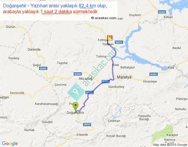 Doğanşehir - Yazıhan arası yaklaşık olarak 90 km/h ile yukarıda belirtilen sürede olup, iki yerin kuş uçuşu uzaklığı (mesafesi) 61'dir. Yolculuk otobüsle 1 saat 20 dakika sürmektedir.