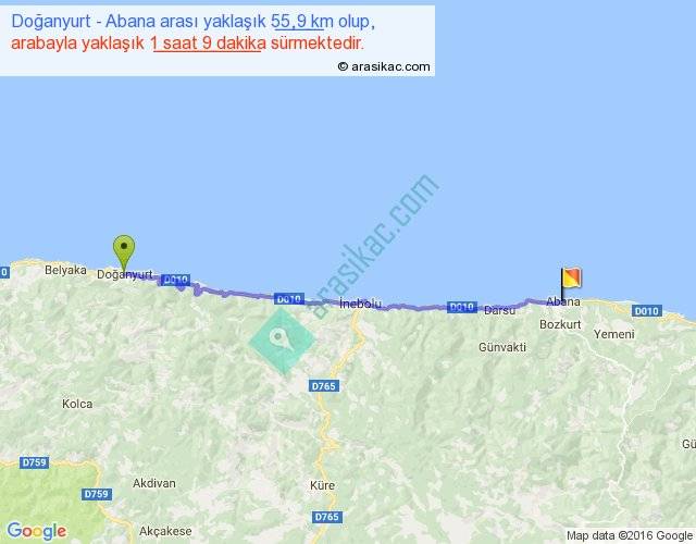 Doğanyurt - Abana arası yaklaşık olarak 90 km/h ile yukarıda belirtilen sürede olup, iki yerin kuş uçuşu uzaklığı (mesafesi) 46'dir. Yolculuk otobüsle 1 saat 29 dakika sürmektedir.