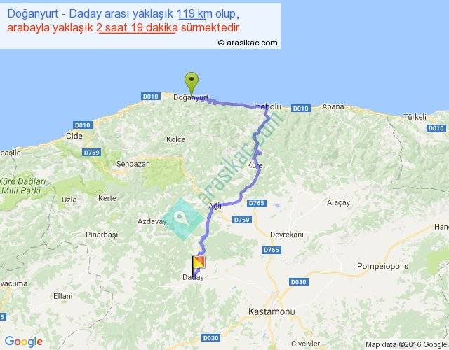 Doğanyurt - Daday arası yaklaşık olarak 90 km/h ile yukarıda belirtilen sürede olup, iki yerin kuş uçuşu uzaklığı (mesafesi) 58'dir. Yolculuk otobüsle 3 saat 0 dakika sürmektedir.