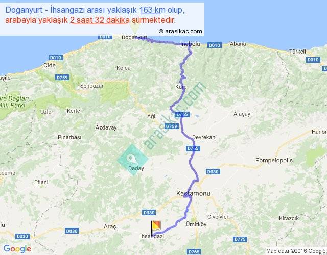 Doğanyurt - İhsangazi arası yaklaşık olarak 90 km/h ile yukarıda belirtilen sürede olup, iki yerin kuş uçuşu uzaklığı (mesafesi) 89'dir. Yolculuk otobüsle 3 saat 17 dakika sürmektedir.