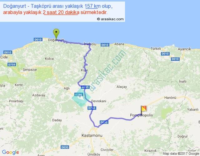 Doğanyurt - Taşköprü arası yaklaşık olarak 90 km/h ile yukarıda belirtilen sürede olup, iki yerin kuş uçuşu uzaklığı (mesafesi) 83'dir. Yolculuk otobüsle 3 saat 5 dakika sürmektedir.
