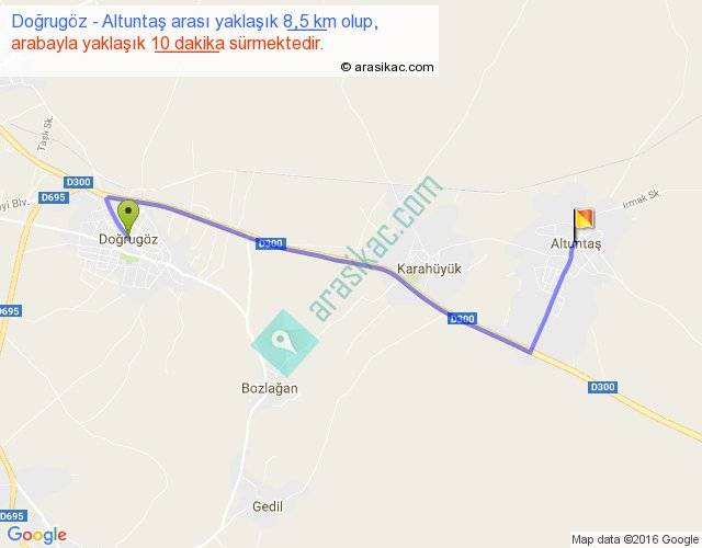 Doğrugöz - Altuntaş arası yaklaşık olarak 90 km/h ile yukarıda belirtilen sürede olup, iki yerin kuş uçuşu uzaklığı (mesafesi) 6'dir. Yolculuk otobüsle 13 dakika sürmektedir.
